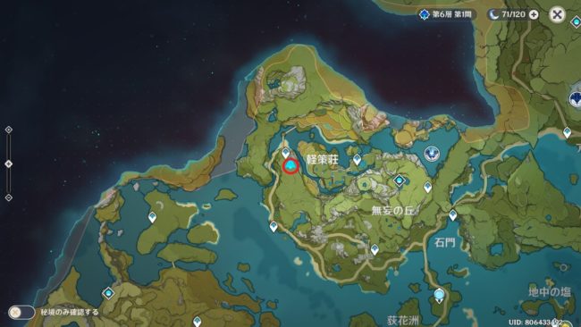 軽策荘の東のワープポイントから南に行ったところにある丘の頂上で、仕掛けを解いて「集めた破片」を入手します。