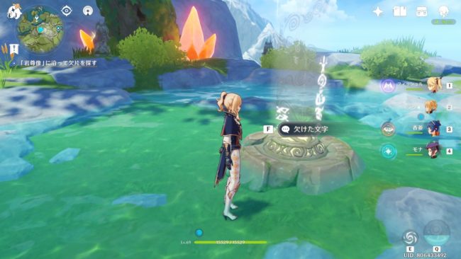 三つの仕掛けを起動し、欠けた文字の近くに出現した宝箱を開けて「集めた破片」を手に入れると任務が進行します。