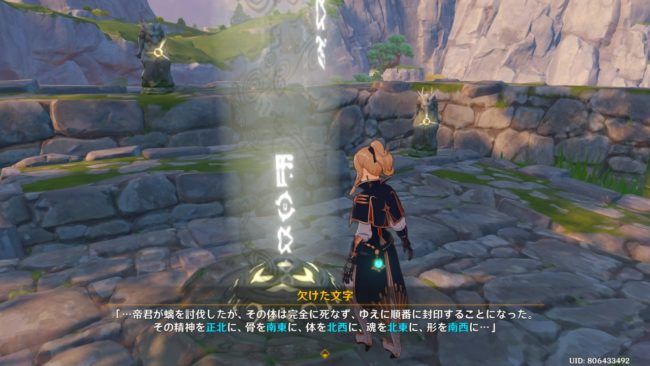 璃月地方、無妄の丘の南、遺跡の前にいるイェンに話しかけると世界任務「「螭」の話」を受注します。